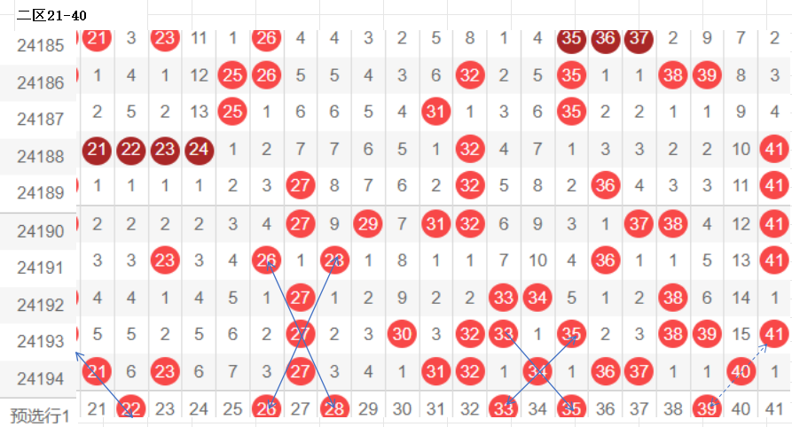 二区(21-40):遗漏5期以下有17个,0码有21 23 27 31 32 34 36 37 40 9个,数据所示,冷码平均,选择条件增多了.上期开出了9个号码,出码比较集中.这期布防相应增加,重码按比例落这区较多,先给出重码21 36。定胆码选择走势比较明显的落位码,隔期的回防码也得多多注意,可带出联动落位关系胆码,这样的形态带出,通常可以称选出重点码,依走势而言,本区间是温热区,可以多多注意形态上的转换,多个胆码都在出位的走势上,选择走势联动较大号码,通常可以选对.