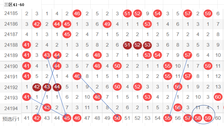 三区(41-60):遗漏5期以下有15码,0码43 56 2个,温开方式,这区码数有回暖之意,可以防一手,先定胆码走势较大者,隔期,斜三连,分边号码,可重防,间隔5期以上号码可以随走势选取,例如本期大冷码,走势比较大,可以做胆,通常联动可带出,分边对称的号码,本区间也有很大走势.可关注下.隐形夹角号码.做补位形态号码.都需要观察动态走势.以上是本区间的选码方法.