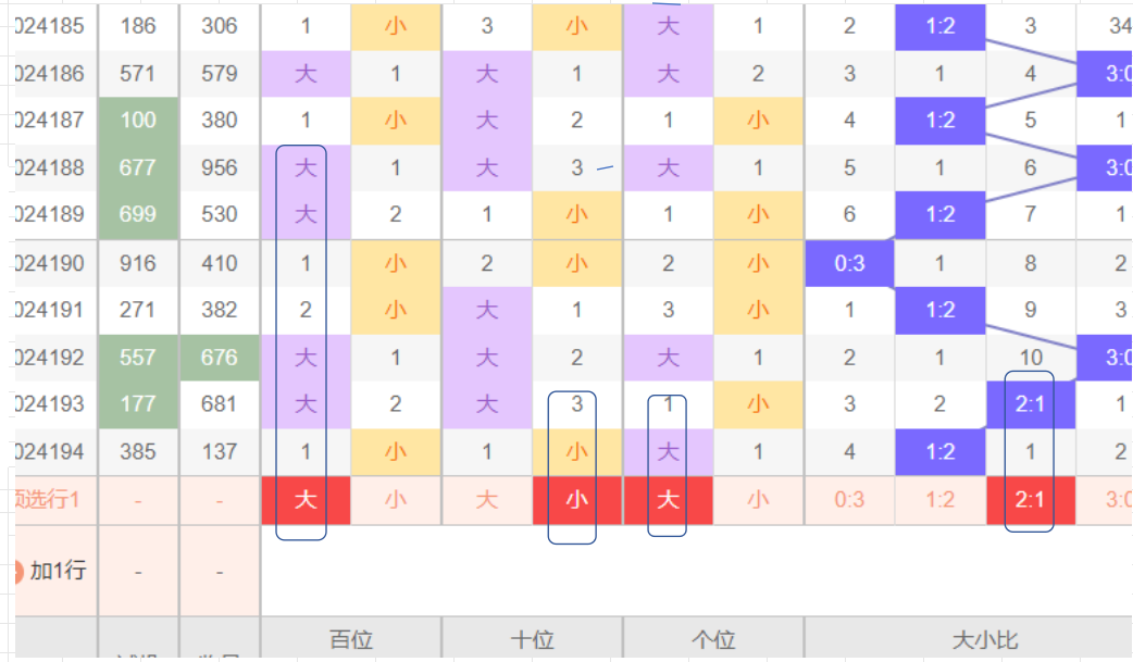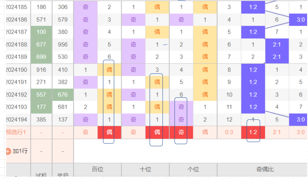 3:如图所示数据,上期开出3奇0偶,个位为奇,开2期.十位为奇,开1期.百位为偶,开1期.比例3:0.本期推测1奇2偶,个位为奇,13579.十位为偶,02468,百位为偶,02468.结合下大小分析进行缩小,