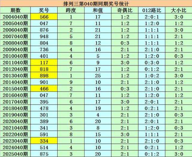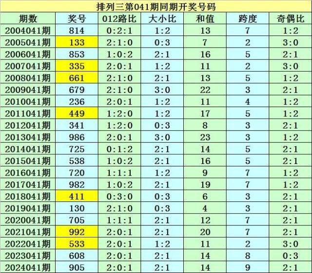 本期为排列三第2025041期开奖,开奖日期为:2025年2月20日,历史上排列三第041期已开出了21次奖号,历年同期开出号码分别为:814-133-853-335-661-679-236-449-341-986-725-538-720-982-411-130-705-992-533-608-905。
