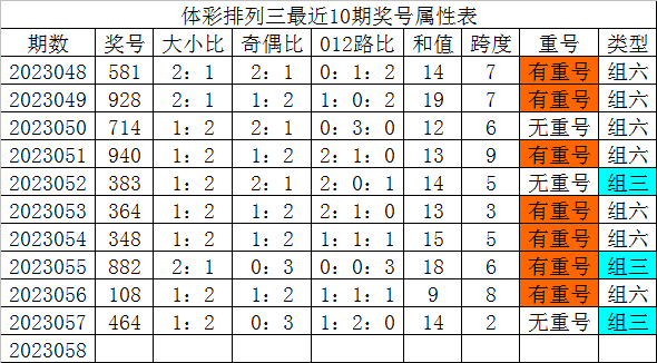 体彩排列三最近10期分别开出奖号:581、928、714、940、383、364、348、882、108、464,各奖号属性详见下表: