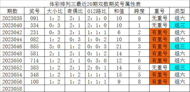 体彩排列三最近20期双数期奖号分别为:091、334、231、082、885、581、714、383、348、108,各期奖号详细属性下表: