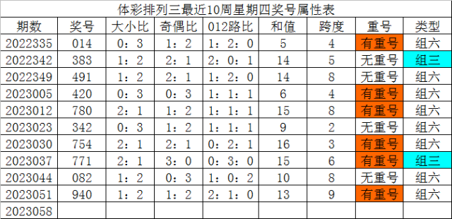 体彩排列三最近10周星期四奖号分别为:014、383、491、420、780、342、754、771、082、940,各奖号属性详见下表: