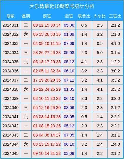 大乐透第2024045期开奖:前区:09、10、14、31、32;后区:03、08。其中大小比为2:3,质合比为1:4,三区比为2:1:2。