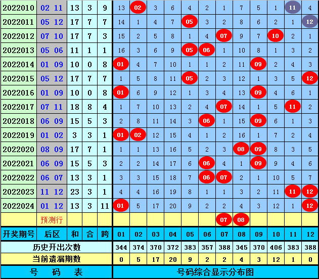 后区分析:上期后区奖号为01+12,遗漏期数为4期+0期。,目前后区热码有6个:01、06、07、09、11、12,后区温码有3个:02、05、08,后区冷码有3个:03、04、10,本期后区看好号码02、03、05、07、08,单挑一注07+08。