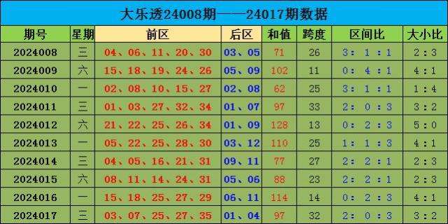 大乐透第2024017期奖号为:03 07 25 27 35+01 04,前区三区比为,2:0:3,和值为97,大小比为3:2,跨度为97,后区奖号为小小组合01 04。