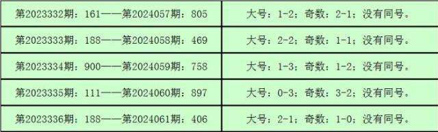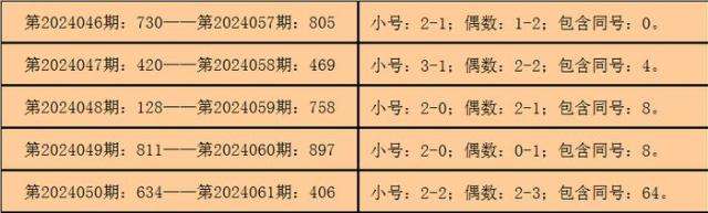 则,3D第2023337期开出奖号:862,其大小比为2:1,奇偶比为0:3,012路比为1:0:2,与3D第2024062期奖号可能没有同号。