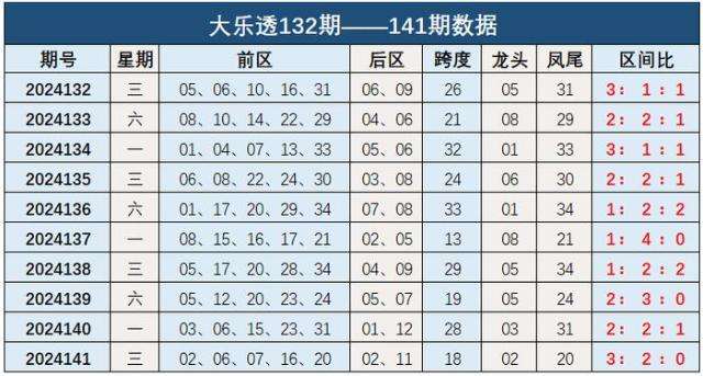 大乐透第2024141期出奖号统计:前区02、06、07、16、20,后区02、11。前区跨度18,龙头02,凤尾20,区间比比3:2:0。