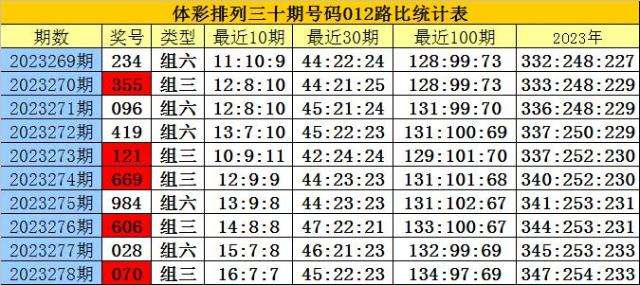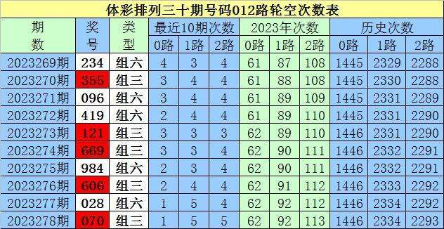 开奖回顾:排列三第2023278期奖号为:070,号码012路比为2:1:0。