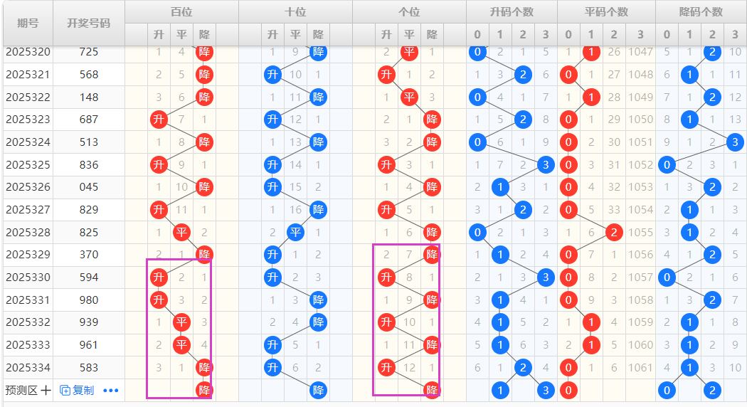 【排列3个位】:近十期升降走势为:升-降-降-升-降-升-降-升,为一种单一加重复性的交错走势,结合走势图可以看出,图中紫色框圈出为一种M形态的出球方式,本期可以重点看好升的形态号码的开出。