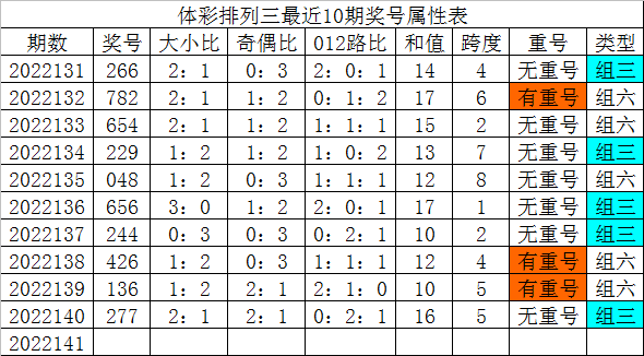 体彩排列三最近10期分别开出奖号:266、782、654、229、048、656、244、426、136、277,各奖号属性详见下表: