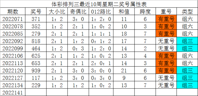体彩排列三最近10周星期二奖号分别为:371、352、279、818、464、625、653、939、117、229,各奖号属性详见下表: