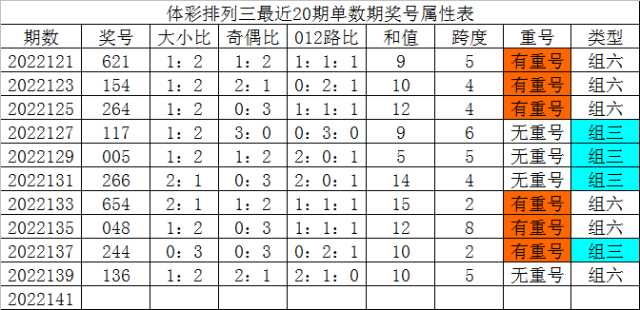 体彩排列三最近20期单数期奖号分别为:621、154、264、117、005、266、654、048、244、136,各期奖号详细属性下表: