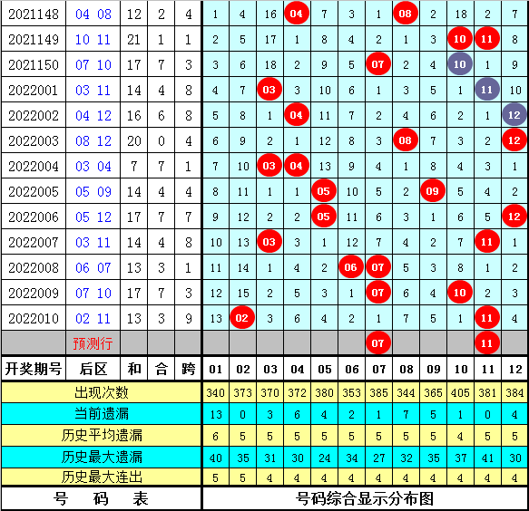 后区分析:上期后区奖号为02和11,最近十期后区开出10个热码、5个温码和5个冷码,本期预计奖号关注热码+热码组合,参考两码07、11。