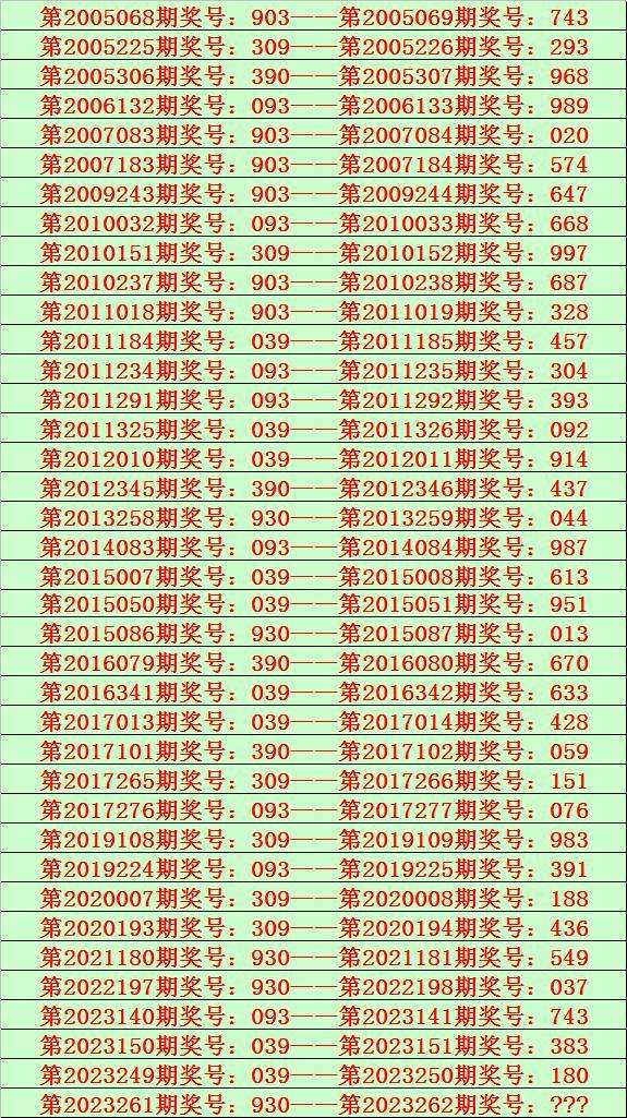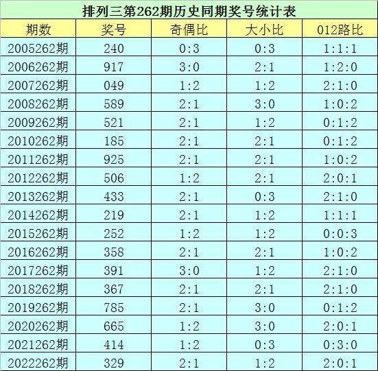 排列三第2023262期开奖日期:2023年9月29日,历史上第262期已开出了18次奖号,历年同期号码分别为:240、917、049、589、521、185、925、506、433、219、252、358、391、367、785、665、414、329。