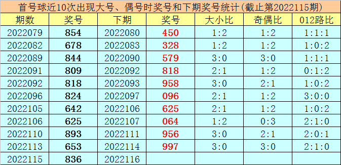 3、在其下期奖号中,个位号码奇偶比为24:30,大小比为31:23,本期个位关注奇号开出,注意号码9。