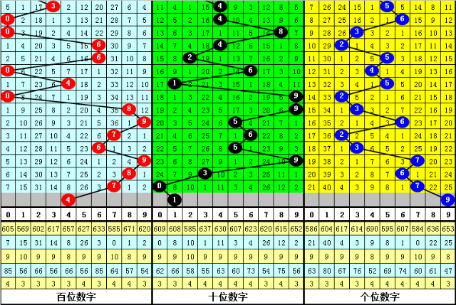 3、在以上0-9号码频次中,号码奇偶比为32:32,大小比为38:26,本期预计百位开出小号,参考号码4。