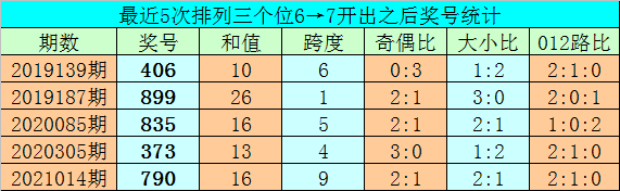 1、排列三前两期个位分别开出号码6和7,历史上个位号码连续两期分别出现6和7时,共有55次。在最近5次出现时,其下期分别出现号码:406、899、835、373、790;