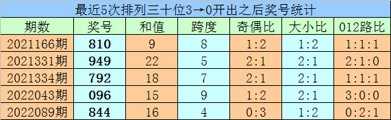 1、最近两期排列三十位号码开出号码分别为3和0,历史上十位号码连续两期同时出现号码3和0的奖号共开出62期。最近五次下期开出号码为:810、949、792、096、844;