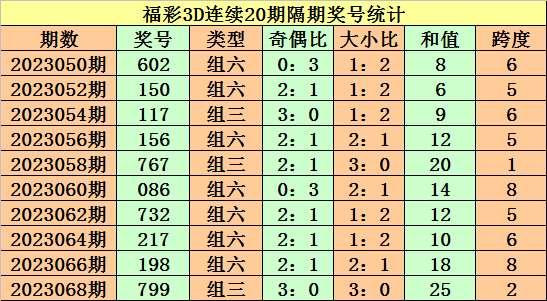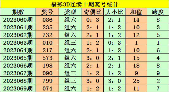 上期回顾:福彩3D第2023069期奖号:074。组六、小大小、偶奇偶。
