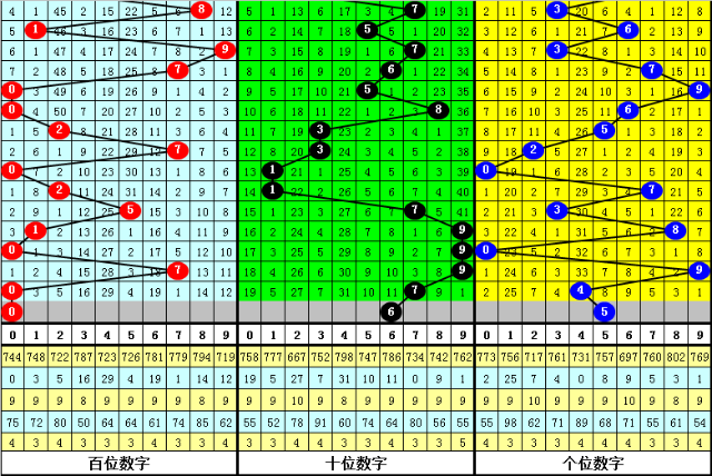 百位:2023065期-2023069期出号:51070,振幅为7点,分布比较分散,本期防百位重复出现。