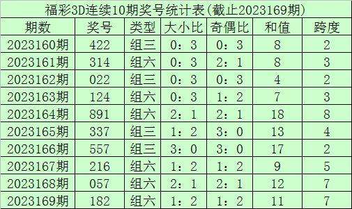 开奖回顾:福利彩票3D第23169期奖号开出182。奖号类型为组六,奇偶形态为奇偶偶,大小形态为小大小。