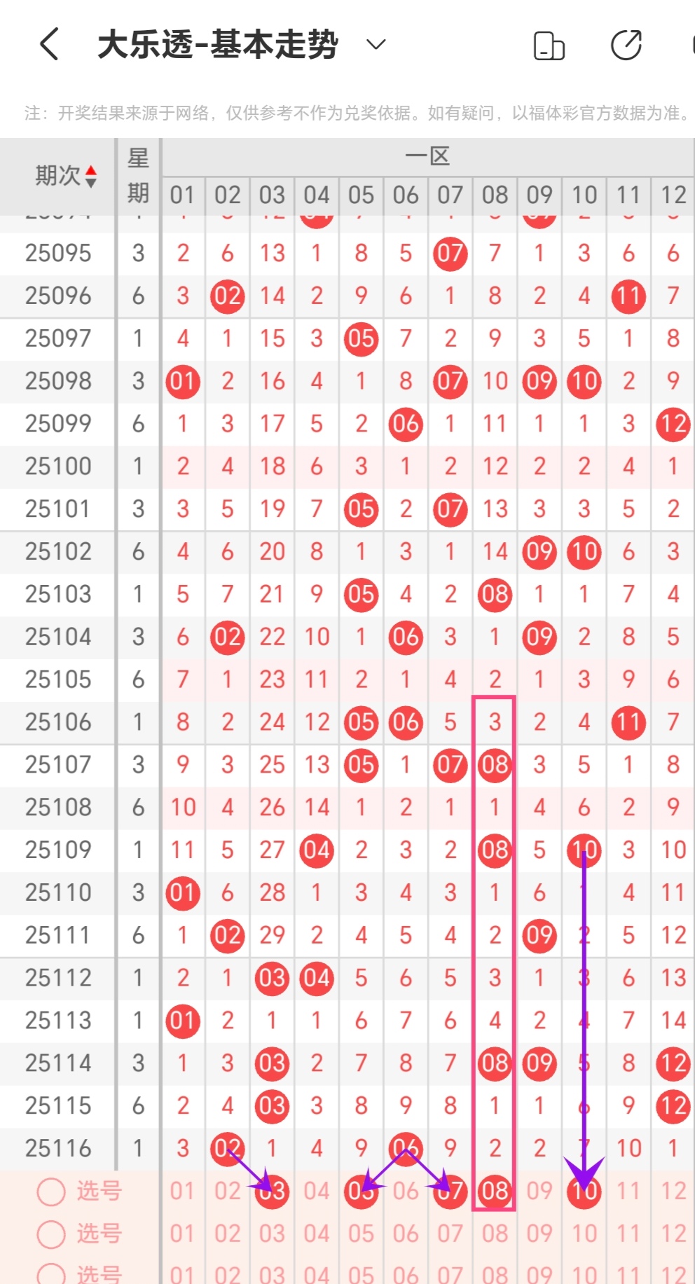 通过对周三重号出现的数量规律进行统计分析,本期考虑出号0-1个,即03-08-09-12-16出号0-1个