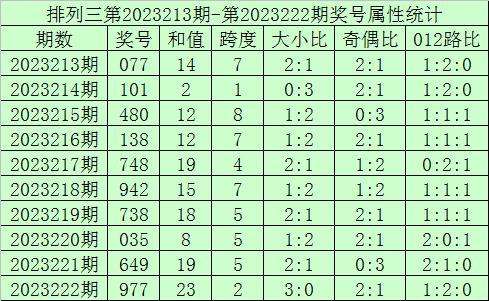 上期回顾:排列三第2023222期开奖号:977,奖号和值:23,奇偶比2:1,大小比3:0。