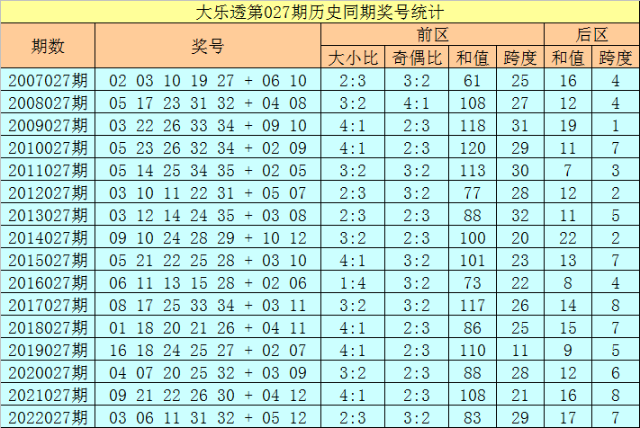 3、前区跨度分析:在第027期历史同期奖号中,前区跨度分布在11-32区段,分布比较广,其中跨度012路比为3:6:7,今年第027期预计开出2路跨度,精选跨度32。