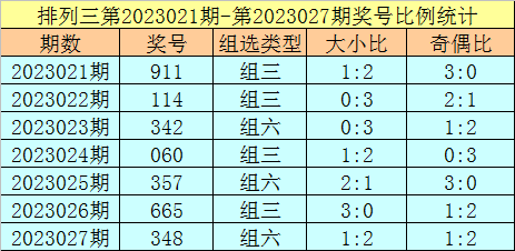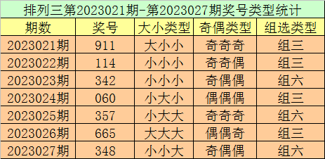 排列三第2023027期回顾:奖号348,奇偶比1:2,大小比1:2,和值15,类型:组六。