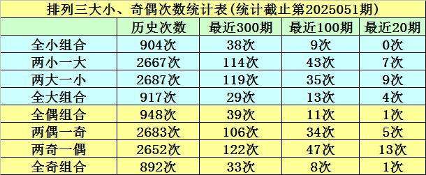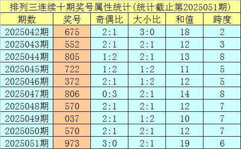 上期回顾:排列三第2025051期奖号:973。类型:组六,奇偶形态:奇奇奇,大小形态:大大小,和值:19,跨度:6。