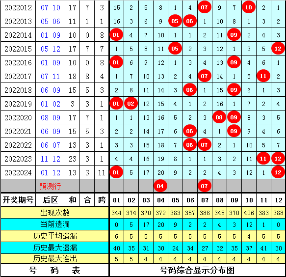 1。在历史同期开奖中,后号码012路比为5:18:7,其中012路号码轮空期数分别为:10期、1期和4期,本期后区012路号码参考0:2:0。
