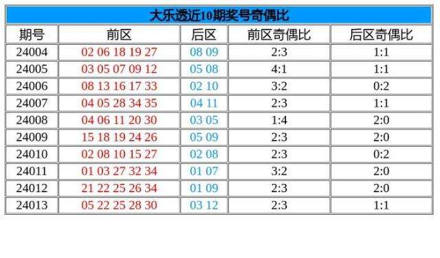 首先我们先来回顾一下上期的大乐透开奖。体彩大乐透第24013期奖号开出:05 22 25 28 30 + 03 12,其中5个前区号码的奇偶比为2:3,2个后区号码的奇偶比为1:1。