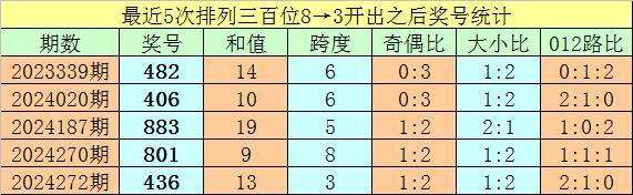 1、排列三最近两期百位号码分别开出8和3,历史上百位号码连续两期分别开出8和3的奖号出现了79期。前五期开出之后其下期奖号分别为:482、406、883、801、436;
