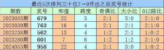 1、最近两期排列三十位号码开出号码分别为7和9,历史上十位号码连续两期同时出现号码7和9的奖号共开出72期。最近五次下期开出号码为:679、763、562、601、958;
