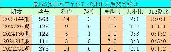 1、排列三前两期个位分别开出号码7和8,历史上个位号码连续两期分别出现7和8时,共有67次。在最近5次出现时,其下期分别出现号码:563、126、122、111、275;