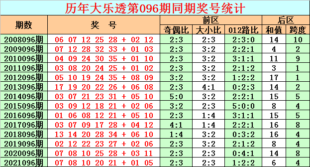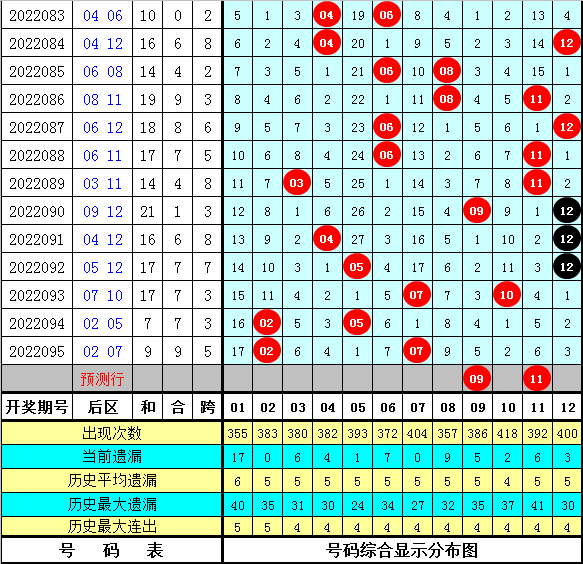 在历史同期开奖中,后区号码和值奇偶为5:9,其中偶号和值开出比例较高,本期预计偶号和值继续热出,参考和值20。