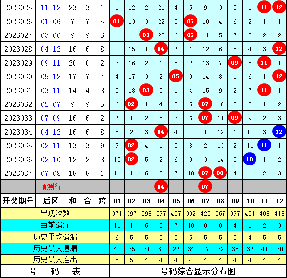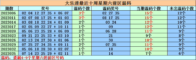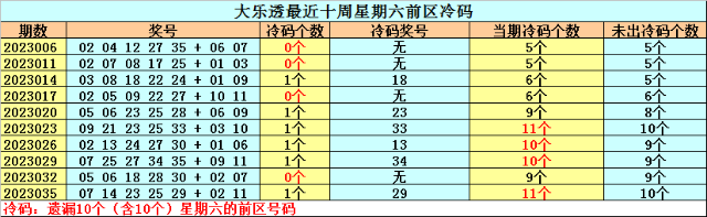 冷号分析:前区冷号在最近十周星期六开出6个,平均每期有。6个,冷号有解冻的趋势,近期继续放弃冷号,上周星期六冷号解冻1个,冷号明显解冻,目前星期六有10个冷号,本周星期六注意冷号继续开出,关注冷号10 15。