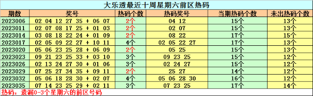 热号分析:最近十周星期六前区热号出现27个,每期平均开出2。7个,热号开出比例较高,上周星期六热号开出3个,热号出现频次较高,目前星期六热码有16个,本周星期六防热号开出走冷,在2个以内开出,热号参考13 29。