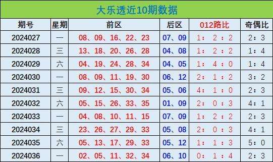 大乐透第24036期开出奖号:02 05 11 32 34+06 10;其中前区012路比为0:1:4,奇偶比为2:3。