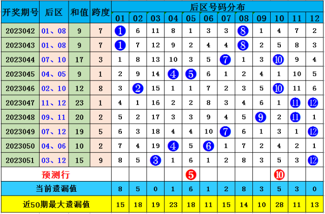 后区分析:大乐透后区上期开出奇偶组合,跨度为9。近10期后区奇偶组合出现6期,偶奇组合出现1期,奇奇组合出现1期,偶偶组合出现2期,本期预计奇偶组合回补;近10期后区两码跨度1-5开出6次,6-11开出4次,预计本期后区两码跨度为5,两码综合推荐:05、10。
