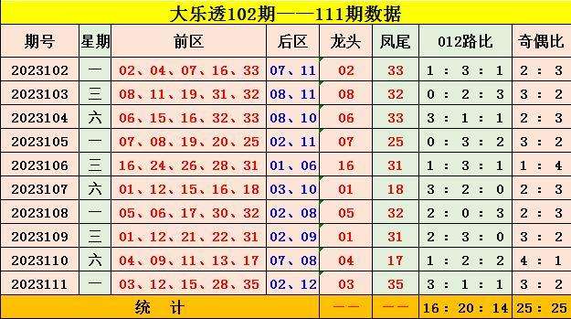 上期回顾,大乐透第2023111开奖,本期奖号:前区03 12 15 28 35;后区02 12,当期前区号码大小比为2:3,三区比2:1:2,奇偶比3:2。前区未开出连号,未开出重号。