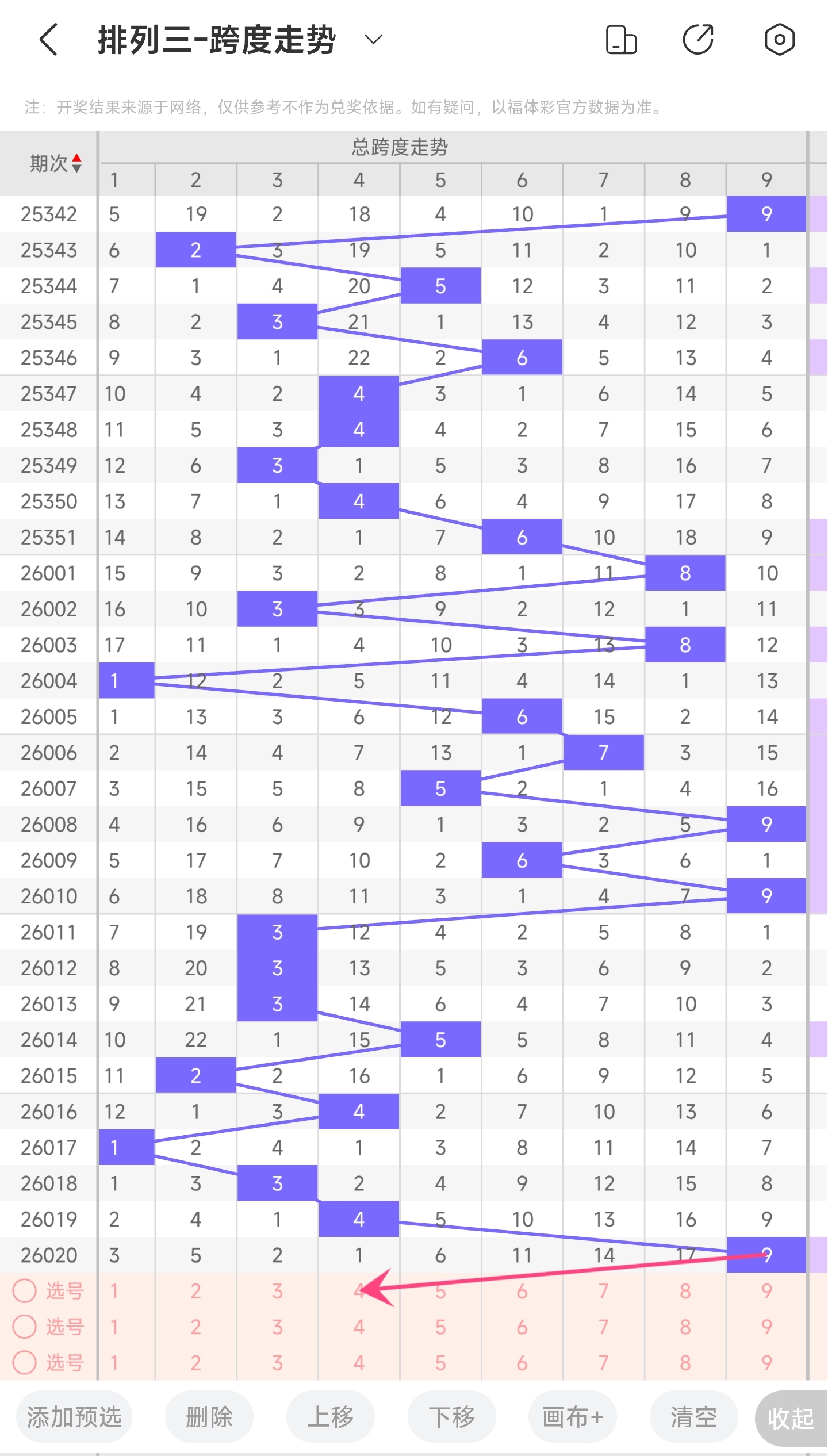 上期跨度为9,往前一期跨度是4,趋势往右移动,偏移量为5。跨度值9时,跨度值是近30期开出最大的值。通过走势图分析,目前的趋势是大概率往左,极小概率不变。所以推测本期跨度可能为34567等跨度。