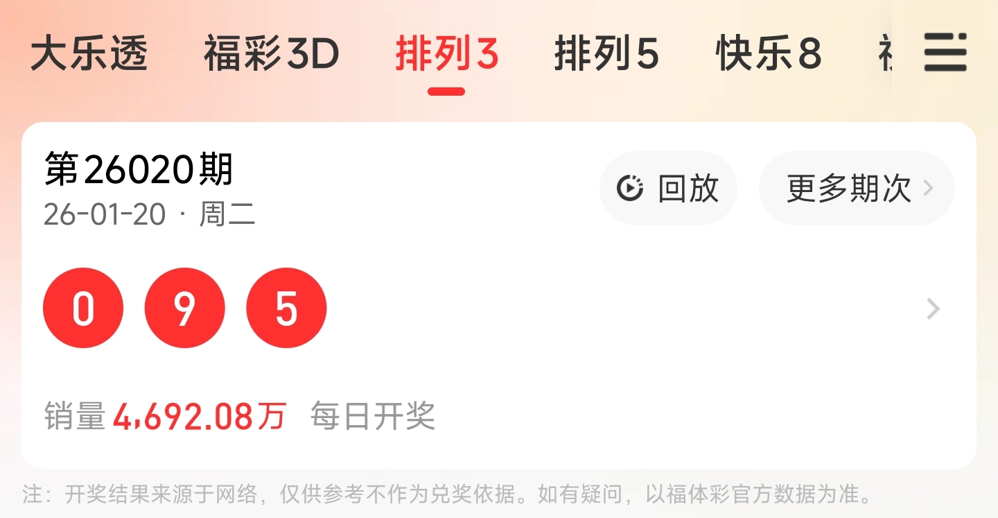 上期排列3开出095,和尾为4,跨度为9,奇偶比为2:1,大小比为2:1,012路个数对比为2:0:1。