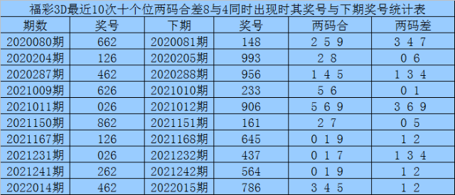 十个位合差分析:上期奖号十个位开出26组合,两码合为8,两码差为4,最近10次十个位两码合8与两码差4同时出现时,其奖号和下期奖号分别为: