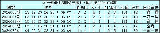 体彩大乐透第24070期奖号为:04 20 21 32 34+02 09,前区奇偶比为1:4,大小比为4:1,012路比为1:2:2,和值为111,跨度为30,后区开出一奇一偶组合。