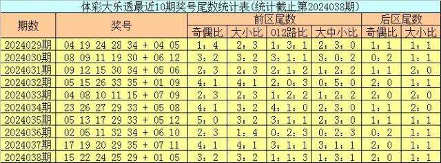 上期回顾:体彩大乐透第2024038期开出号码:15 22 24 25 29 + 01 05,其中前区奖号尾数奇偶比为3:2,大小比为3:2,012路比为1:1:3,大中小比为1:3:1,后区奖号尾数奇偶比为2:0,大小比为1:1。
