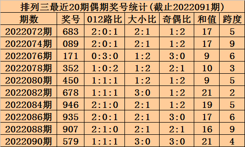 上期回顾:排列三2022091期奖号为809,奇偶比为1:2,大小比为2:1,跨度为17。