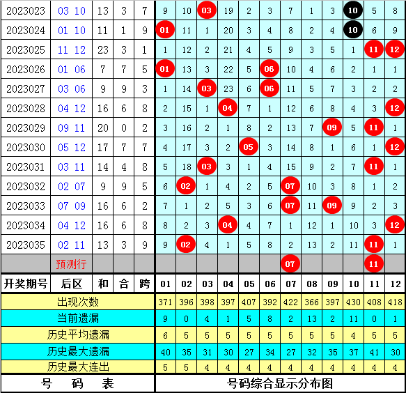 前区五区分析:上期第四区出号比例较高,第三区号码轮空。本期预计第一区号码大热,第三区号码轮空,关注五区比2:1:0:1:1。