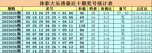 上期开奖:大乐透第2023035期奖号为:07 14 23 25 29 + 02 11,前区号码和值为98,跨度为22,奇偶比为4:1,重号:07,五区比为1:1:0:2:1。